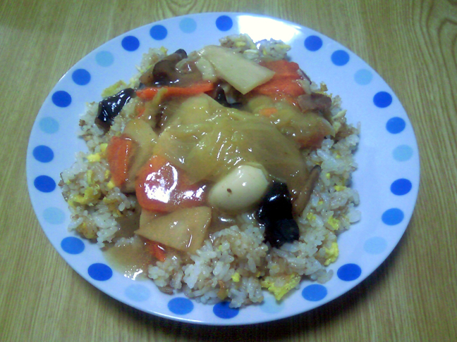 卵とご飯を炒めたものに、中華丼を乗せるという。