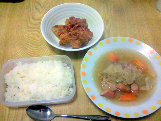 温めたご飯と、昨日作ったコンソメスープと唐揚げです。
