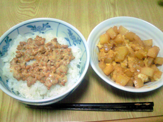 普通の納豆ご飯と、ジャガイモの煮物。