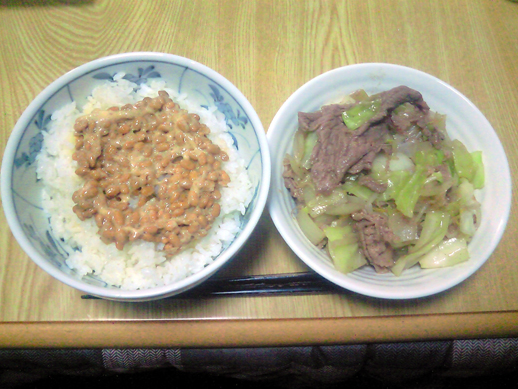 納豆卵掛けご飯と、野菜炒め的なものです。